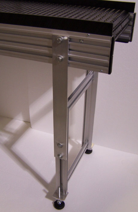 Safe Conveyor Inc. stands are constructed of heavy gage aluminum extrusions that attach with "T" slot hardware to the sides of the conveyor sections. The base of the stand has adjustable leveling pads that can be free standing or bolted to the floor. Stands support static loads up to 200 lbs per conveyor section. Optional swivel locking casters for the stands are available. |